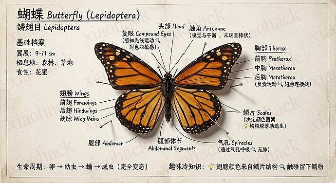 # 博物馆级昆虫标本科普图谱 · 蝴蝶 请创建一张**博物馆展品级别的昆虫知识科普图谱**, 聚焦展示一只真实存在过、被采集并记录的【蝴蝶】。 --- ## 核心概念 整个画面是一张**单独的实体标本记录纸**, 平铺在工作台上,从**正上方垂直俯视**。 蝴蝶标本、昆虫针、文字、标注**共享同一真实物理平面**。 这不是插画,也不是版式设计, …