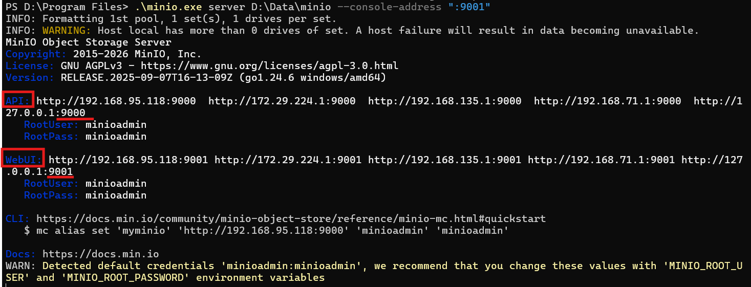 此时MinIO的API将运行在9000端口,MinIO Console管理页面将运行在9001端口;