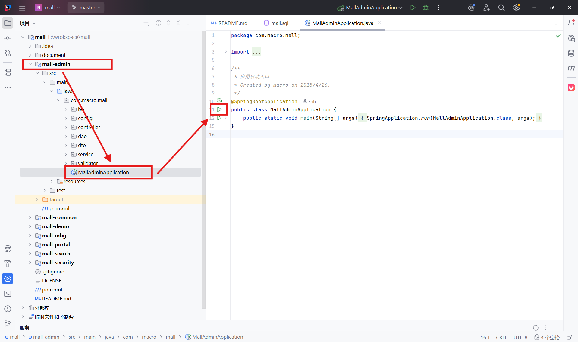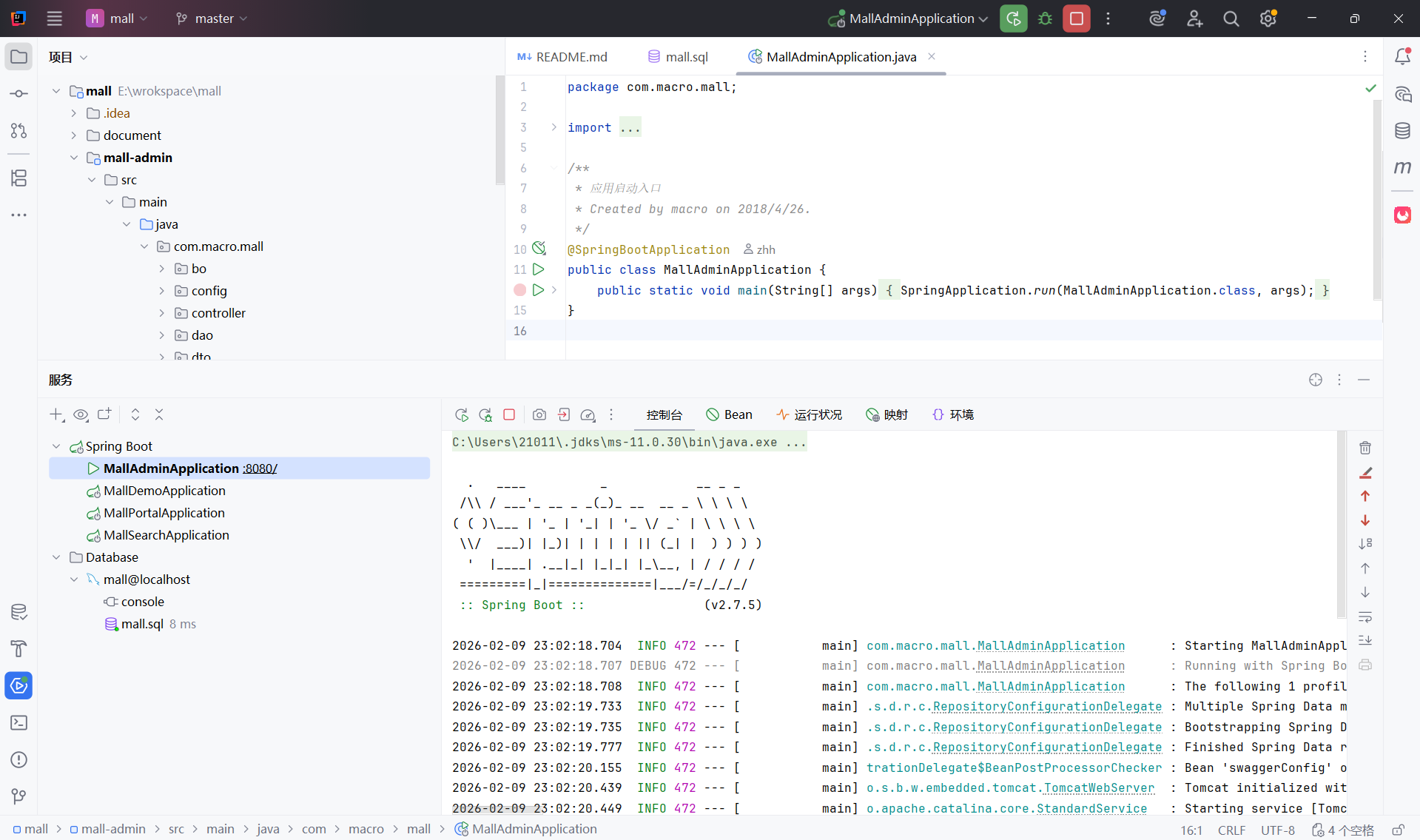 启动mall-admin模块,直接运行`com.macro.mall.MallAdminApplication`即可;