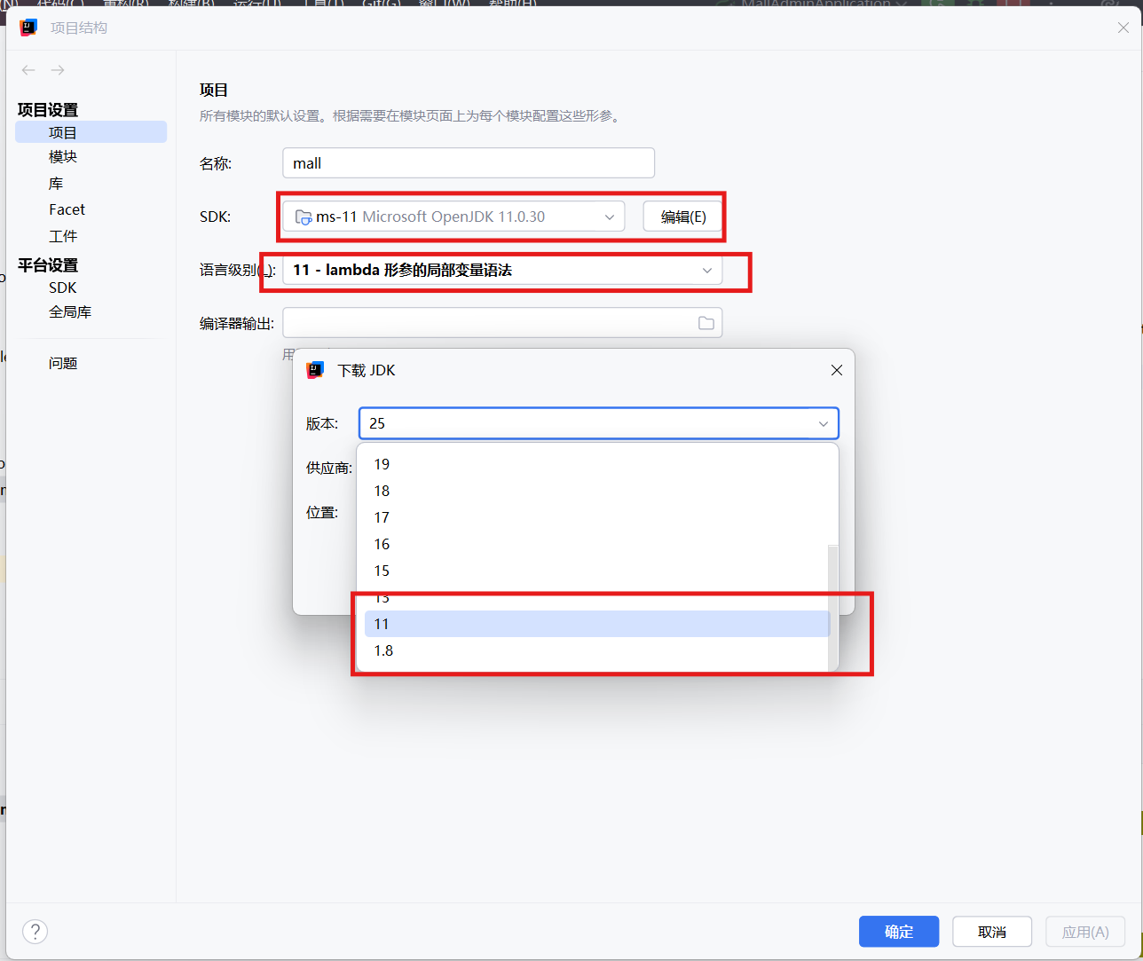 将JDK和语言级别同时设置为JDK1.8或JDK11