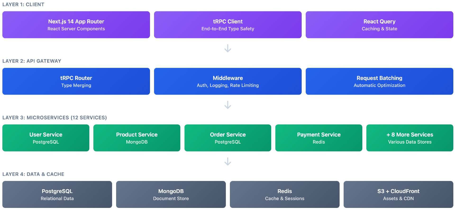 typescript// apps/web/src/trpc/client.tsimport { createTRPCReact } from "@trpc/react-query";import { httpBatchLink } from "@trpc/client";import type { AppRouter } from "@/server/routers/_app";import superjson from "superjson";export const trpc = createTRPCReact<AppRouter>();export function createTRPCClient(){ return trpc.createClient({ links: [ httpBatchLink({ url: process.env.NEXT_PUBLIC_API_URL + "/api/trpc", transformer: superjson, headers: async () => { const session = await getSession(); return { authorization: session?.token ? `Bearer ${session.token}` : "", }; }, }), ], });}生产环境中使用的流程结构