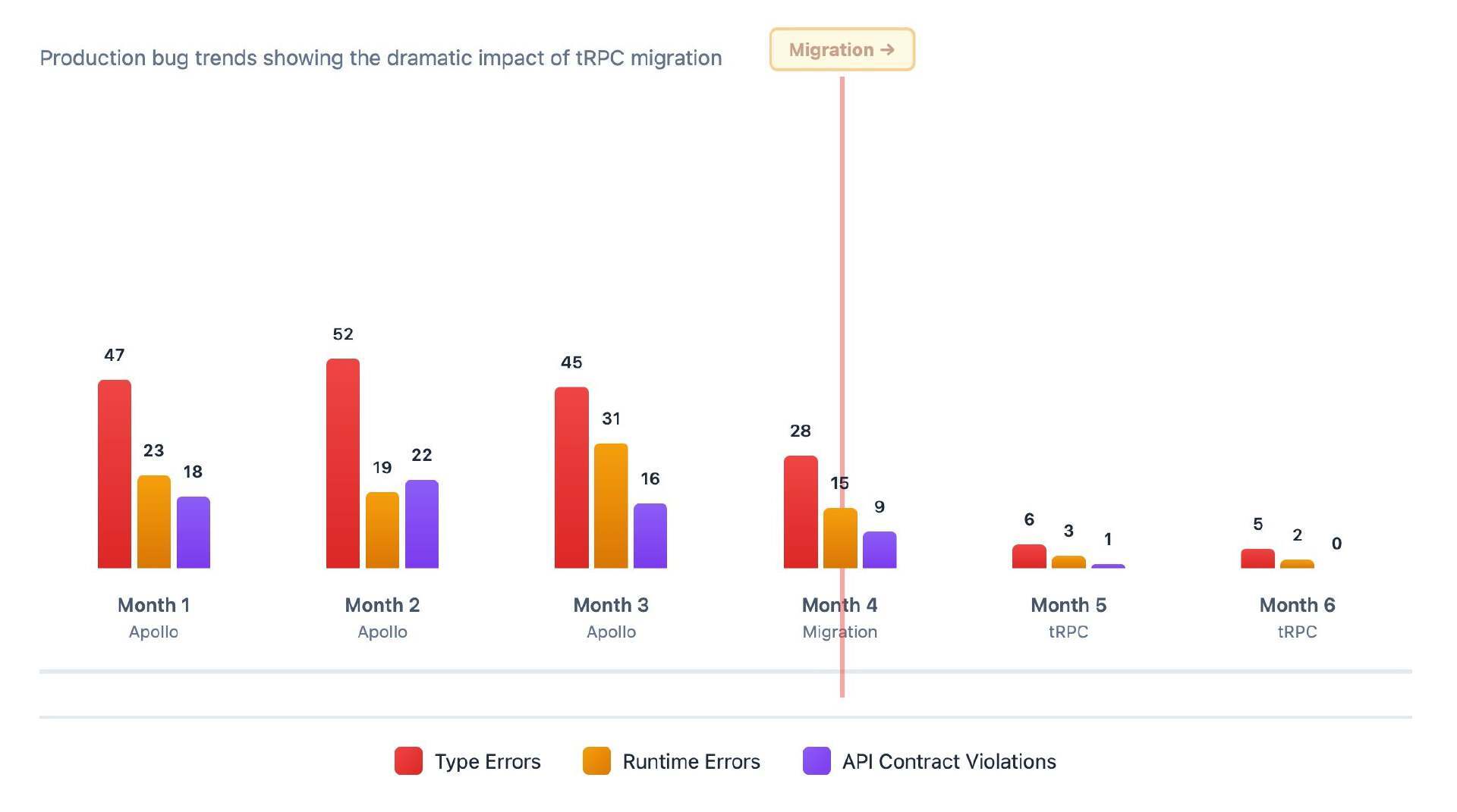 我得跟你们说句实话。六个月前,我还是GraphQL Federation的布道者。我们花了六个月的时间,利用Apollo构建了一个联邦图,其中包含模式拼接、网关配置,以及一套复杂的 CI/CD 管道(每次提交都会重新生成类型)。纸上谈兵时,这套方案看起来很完美。但在生产环境中呢?每次部署都像是要发生一场灾难。 转折点发生在周五下午的一次例行部署中。我们的产品团队更新了某项服务中的一个字段类型,模式重新生成成功,测试通过,于是我们将其发布。三十分钟后,我们的移动应用开始崩溃,原因是 iOS 客户端仍在使用两小时前生成的旧类型。模式的版本已经更新,网关也已经升级,但客户端代码生成尚未运行,因为有人忘记触发它了。这正是 GraphQL 联邦架构中的一个典型痛点。 那时,我开始研究tRPC。最吸引我的是,它不需要繁琐的模式定义就可以实现端到端的类型安全。不需要 SDL 文件,不需要代码生成步骤,也不需要联邦网关。从头到尾,只需 TypeScript 即可。自然,我还是心存疑虑。毕竟我们已经在 Apollo 上投入了大量的资源。但在看到一些大规模部署 tRPC 的公司所提供的生产环境指标后,我说服团队构建了一个概念验证。 下文记录了我们的完整迁移过程,包括我们犯过的错误、意想不到的性能提升,以及对当前生产环境架构的回顾——该架构每日能够处理 240 万次请求,并保持 99.97% 的可用性。这不是一份通过简单项目介绍 tRPC 的教程,而是将 tRPC 投入生产环境应用所需的实际经验。 图 1: tRPC 如何在没有模式定义的情况下实现端到端安全性 关于 GraphQL Federation,有件事没人会告诉你:模式会成为单点故障。使用 tRPC 时,你的 TypeScript 类型就是契约。没有中间表示形式,无需维护 SDL,也不需要在不同的环境间保持模式注册表的同步。 在运行 Apollo Federation 时,典型的类型变更流程如下:更新 GraphQL 模式 → 运行代码生成 → 提交生成的文件 → 更新解析器实现 → 更新客户端查询 → 运行客户端代码生成 → 部署两项服务 → 祈祷一切正常。 使用 tRPC 呢?更新 TypeScript 接口 → 就这样。客户端会立即知道,因为它们共享相同的类型定义。 图 2:在每分钟 10000 次请求的持续负载下测得 我们进行了生产环境负载测试,将旧版的 Apollo Federation 架构与新版的 tRPC 实现方案进行了对比。测试结果令人震惊。对于我们的无服务器函数而言至关重要的冷启动性能提升了 75% 。Apollo Federation 的网关开销在冷启动时会增加 180 毫秒,而 tRPC 仅需 45 毫秒。这还是在我们尚未进入实际业务逻辑之前。 在持续负载下,其平均响应时间从 38 毫秒降至 12 毫秒。但真正关键的是 P95 和 P99 延迟。使用 Apollo 时,我们的 P95 延迟为 85 毫秒,P99 延迟为 156 毫秒。迁移后,P95 延迟降至 28 毫秒,P99 延迟降至 42 毫秒。这些尾部延迟会严重影响用户体验,尤其是在移动网络上。 关于资源包大小的故事同样令人惊叹。我们基于 Federation 的 Apollo Client 设置在 gzip 压缩后为 142KB 。而采用 tRPC 搭配 React Query 的方案呢?仅需 28KB 。也就是说,大小减少了 80%。在网速较慢的情况下,这意味着页面初始加载速度可以提升 2 到 3 秒。真实用户立刻就会感受到这一差异。 我们的生产环境是一个基于pnpm工作区的单库(monorepo),前端采用 Next.js 14 App Router,所有 API 通信均通过 tRPC 实现。我们有 12 个微服务,每个微服务都暴露自己的 tRPC 路由器,并由一个网关层将它们全部整合在一起。在实际应用中,其结构如下: 图 3:12 个微服务,每日 240 万次请求,99.97% 的可用性 每个服务都有自己的业务逻辑和数据库。用户服务与 PostgreSQL 通信,产品服务使用 MongoDB 存储商品目录数据,订单服务则利用 Redis 进行会话管理。tRPC 的优势在于,类型安全贯穿于整个技术栈。当产品服务更改字段类型时,TypeScript 会立即向所有调用方发出警告。 人们对 tRPC 的一个担忧是,它不像 GraphQL 那样内置请求批处理功能。实际情况是:对于 90% 的用例来说,React Query 的批处理功能已经绰绰有余,而且实际上比 GraphQL 的 DataLoader 模式更容易调试。我们在生产环境中每分钟处理 10000 次请求,批处理功能运行得非常完美。 我们的缓存层结合了用于共享数据的 Redis 以及客户端一侧的 React Query 智能缓存。这种组合非常强大,因为 React Query 能精确掌握已有的数据并能即时从缓存中提供数据,而我们的服务器端 Redis 缓存则能高效地处理跨用户数据。目前,产品数据的缓存命中率为 87% ,用户偏好数据的缓存命中率为 92% 。 我们没有进行彻底重写。那样做需要六个月的毫无业务价值的工作,这会让管理层陷入恐慌。相反,我们采用了“绞杀榕模式”:让两个系统并行运行,逐个迁移端点,验证稳定后再继续推进。 我们首先从流量大但业务风险低的只读端点入手,例如用户资料查询、产品目录查询等。这些操作为我们提供了有关性能和可靠性的真实生产数据,同时又不会危及关键的写入操作。在完全切换之前,我们将两个 API 版本并行运行了三周,对比了错误率和延迟指标。 一旦从读取操作上获得了信心,我们就着手处理写入操作,包括订单创建、支付处理、库存更新。这些操作一旦出错,就会造成实际的损失。这正是 tRPC 的类型安全真正大放异彩之处。使用 GraphQL 时,我们要不断地处理可空字段、可选参数以及模式漂移问题。而使用 tRPC,只要类型编译通过,就消除了这一整类的 API 契约错