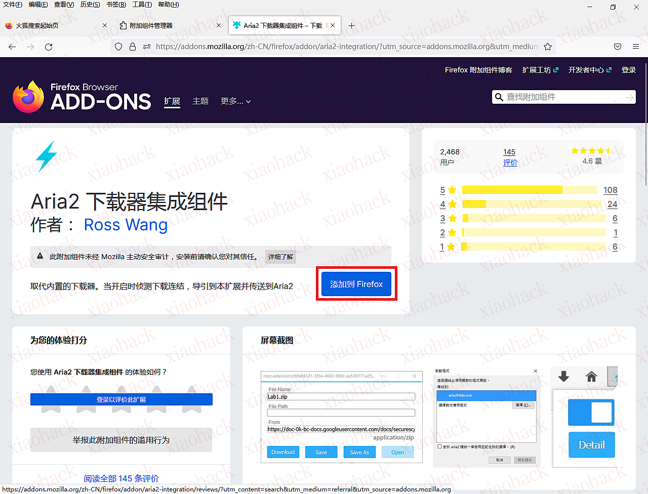 或直接在浏览器中输入:https://addons.mozilla.org/zh-CN/firefox/addon/aria2-integration/ 直接打开“Aria2 下载器集成组件”页面