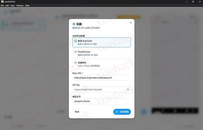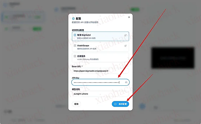 复制生成的 Key,粘贴到 AutoGLM-GUI 的配置界面中即可(URL 默认已经配置好,如果只是使用官方模型,不需要修改)