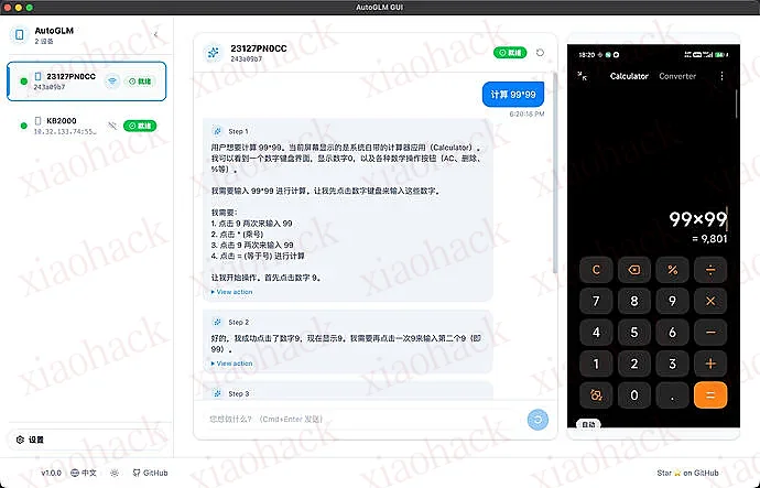 开启 USB 调试之后,界面上面应该就直接显示出你的设备了,代表着配置完毕,可以开始体验了,可以打开计算器,让 ai 简单操作一下,如果没啥问题就代表一切就绪了。