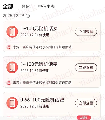 电信 APP - 我 - 我的奖券 - 口令兑换 0.66-100 话费