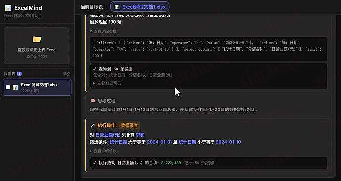 上传 Excel 文件后,我们可以用自然语言跟 AI 对话,AI 会自主决策,自主调用工具,完成 Excel 的分析任务。