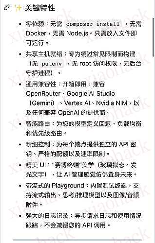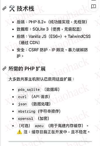 以下是他的专案介绍,主打无需 composer install ,无需 Docker,无需 Node.js。只需放入文件即可运行。