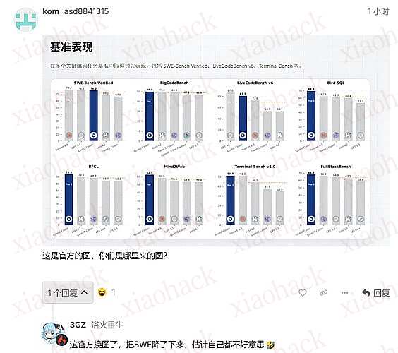 很快有社区用户(@xeophon)发现在 SWE-bench 测试中,官方配置有无,模型输出中错误引用了 未来日期的 Git commit,相当于考试直接看到答案,大概 24% 的内容都受到了影响,此次测试无效。